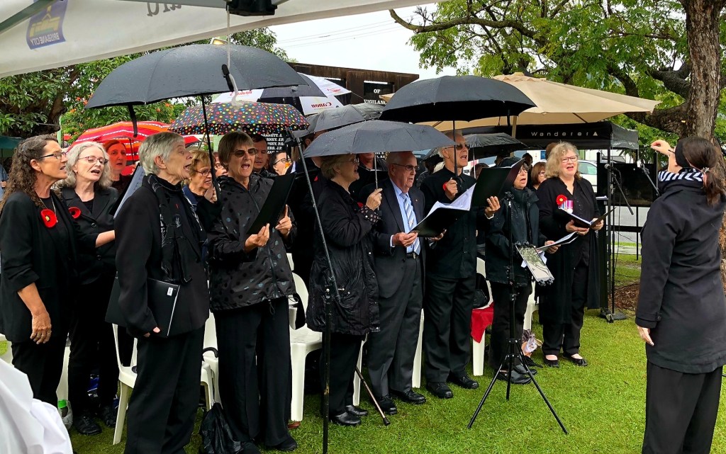 On Monday 25 April 2022 the Moorooka District Community choir performed at a moving commemoration Salisbury RSL Park – Industries Road, Salisbury. We gave 2 performances, the 5.00am dawn service and then the 8.00am morning service. We demonstrated our dedication by singing through the rain.